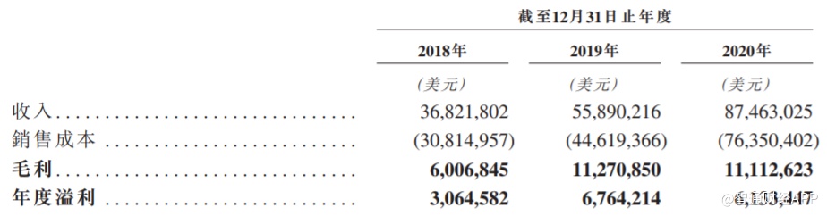 截至2018年、2019年及2020年12月31日止年度,公司收入分别为3682.18万美元、5589.02万美元、8746.30万美元,年度溢利分别为306.46万美元、676.42万美元、613.34万美元。