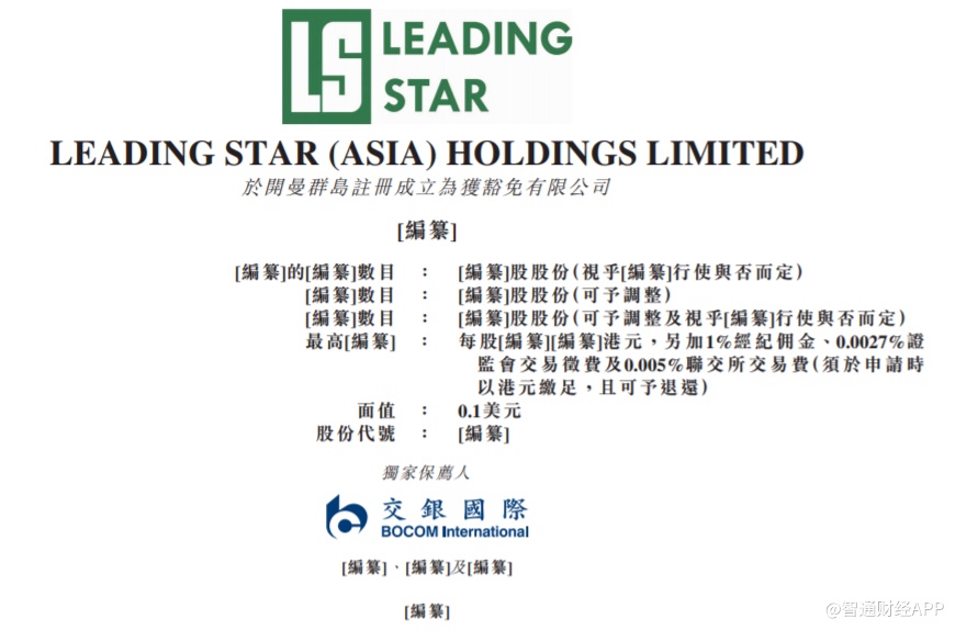 智通财经APP获悉,据港交所6月29日披露,Leading Star (Asia) Holdings Limited向港交所主板提交上市申请。交银国际为独家保荐人。