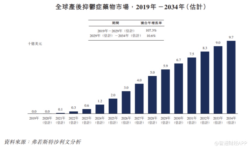 由于在2019年以前,市场上都没有专门针对PPD的药理干预措施,因此在全球形成了庞大的未满足治疗市场。据弗若斯特沙利文资料显示,在2019年引入相关创新疗法后,全球产后抑郁症药物市场实现大幅增长,市场规模预计将在2029年达到59亿美元,期间复合增长率达到107.3%。