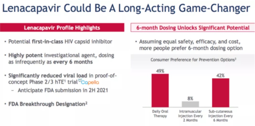 其中吉利德推出了HIV capsid抑制剂新药Lenacapavir快速开发其用于艾滋病治疗长期方案或预防方案。
