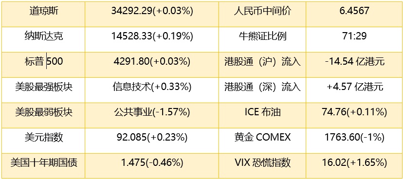 1、 隔夜美股截至收盘,纳斯达克综合指数涨27.83点,涨幅0.19%,报14528.33点;道琼斯指数涨9.02点,涨幅0.03%,报34292.29点;标普500指数涨1.19点,涨幅0.03%,报4291.80点。港股ADR指数也上涨,按比例计算,收报29159点,上涨165.36点或0.57%。