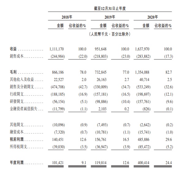 截至2018年、2019年及2020年12月31日止年度,公司收入分别为11.11亿元、9.52亿元、16.38亿元,年度利润分别为1.01亿元、1.20亿元、4.00亿元。