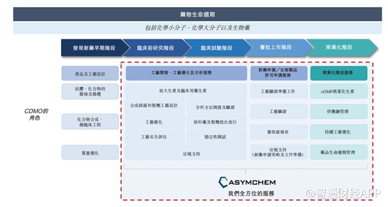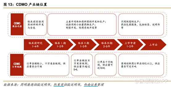 医药CDMO企业侧重于临床及商业化阶段制药工艺的开发和药物的制备,在临床阶段解决了实验室研究成果无法放大的技术难题;在商业化阶段不断优化制药工艺,降低生产成本。
