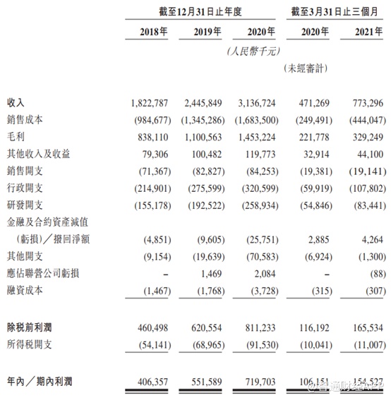 在业绩表现方面,2018年至2020年公司收入分别为18.23亿元人民币(单位下同)、24.46亿元、31.37亿元,年复合增长率为31.2%;期内净利润分别为4.06亿元、5.52亿元及7.19亿元,年复合增长率为33.1%。截至2021年3月31日,公司收入为7.73亿元,较去年同期增长64.1%,利润为1.55亿元,同比增长45.6%。