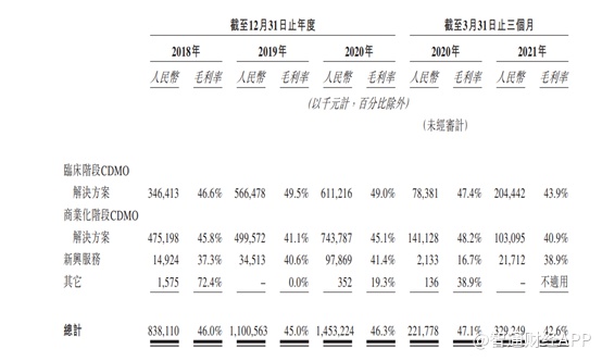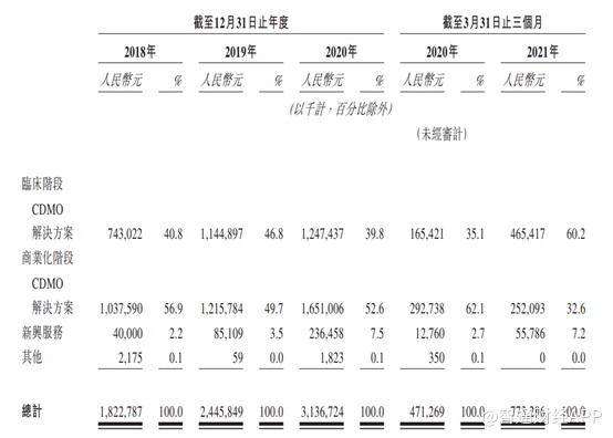 在过往业绩期间内,公司从临床阶段CDMO解决方案获得的收入稳步增加,主要是由于公司的客户群扩大及客户黏性增加导致临床阶段项目数量增加,以及随着现有临床阶段项目跨越开发周期进入后期临床制造,导致生产规模扩大,截至2021年3月31日,该业务收入占比高达60.2%。