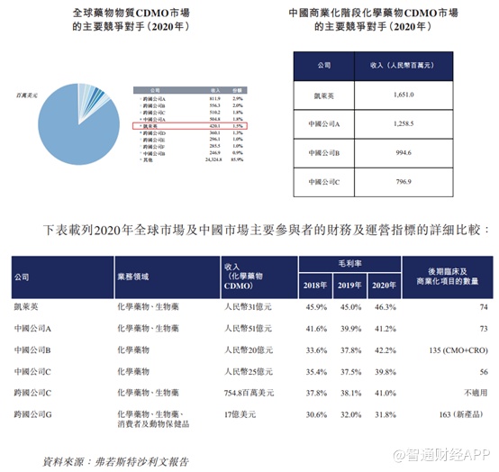 智通财经APP了解到,凯莱英是全球领先、技术驱动型的CDMO公司,提供贯穿药物开发及生产全周期生命的一站式服务及解决方案。根据弗若斯特沙利文的资料,按2020年的收入计,公司为全球第五大创新药原料药CDMO及中国最大商业化阶段化学药物CDMO。凭藉逾二十年的行业经验,公司就小分子药物提供贯穿临床前、临床及商业化阶段的工艺开发及生产服务。目前公司已将CDMO能力扩展至可纳入新药物类别,如多肽、寡核苷酸、单克隆抗体(mAb)、抗体药物偶联物(ADC)及信使RNA(mRNA),以及其他服务范围,包括药物制剂解决方案、生物合成解决方案和临床CRO解决方案。合作客户包括Mirati Therapeutics、Mersana Therapeutics、再鼎医药、贝达药业、和黄药业、信达生物制药及加科思药业等。