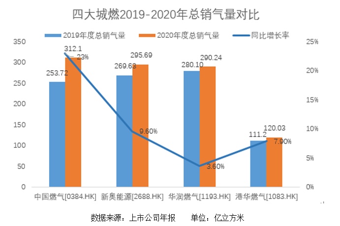 中国燃气2020年销气量增速高达23%,新奥能源为9.6%,华润燃气为3.6%,港华燃气为7.9%。中国燃气销售强劲,销量增速比其它三家公司之和还高,成为城燃行业当之无愧的领跑者。