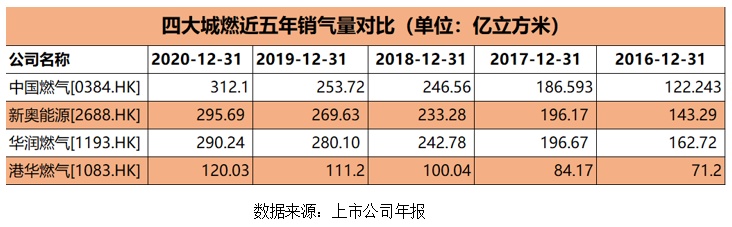 纵观四大城燃集团近五年的销气量,中国燃气年复合增长率达到20.62%,新奥能源为15.59%,华润燃气为12.27%,港华燃气为11.01%,中国燃气年复合增长率远高于新奥能源,是港华燃气的近2倍。
