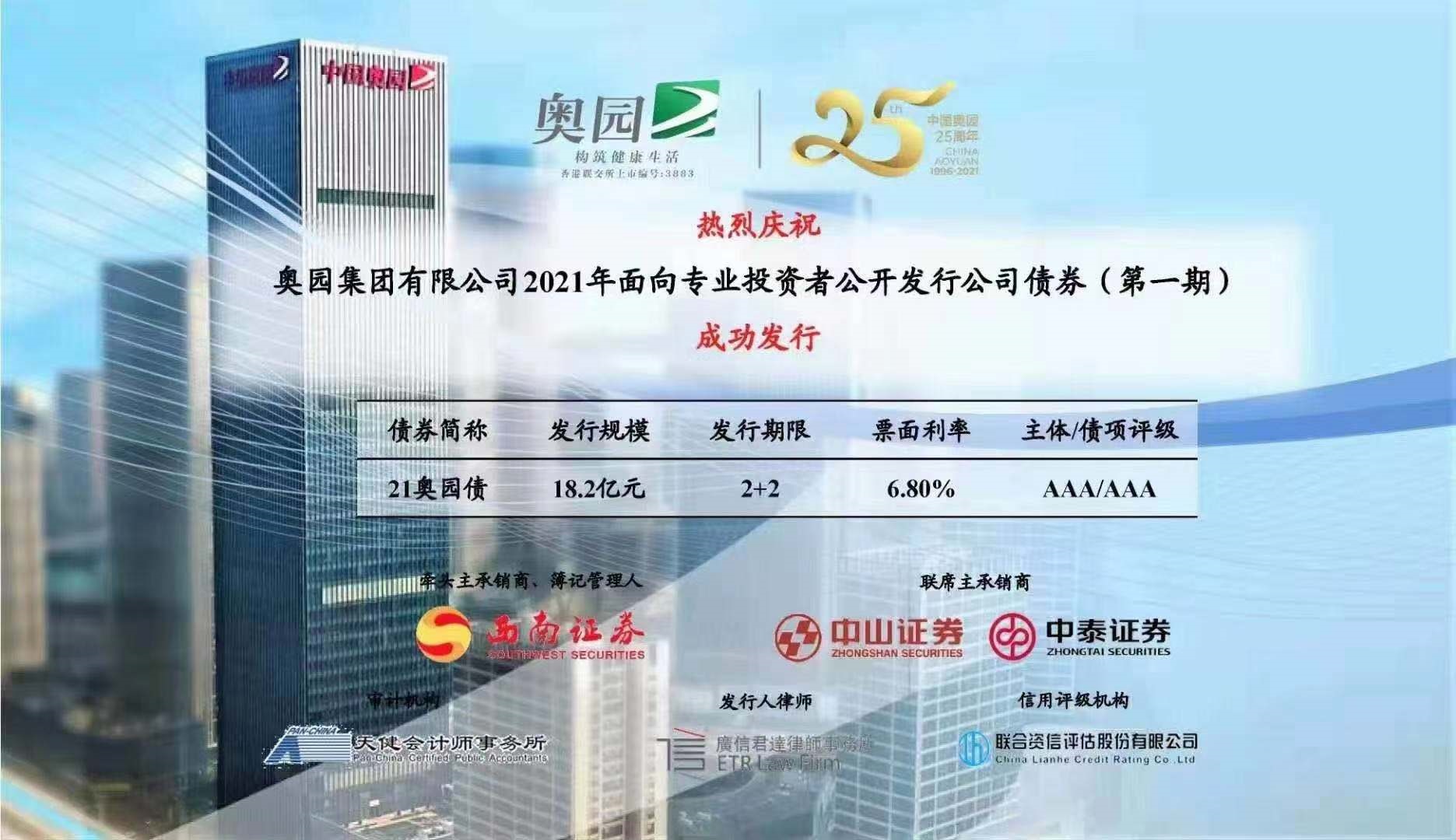 今年以来,奥园紧抓市场窗口期,通过境内外多元渠道安排再融资,先后发出三笔合共7.38亿美元优先票据,完成两轮合共逾21亿港元三年期境外银团贷款,并成功发行人民币18.2亿元公司债,同时,奥园一贯注重企业信用,已悉数赎回今年内到期的公募境外优先票据,持续优化债务结构。