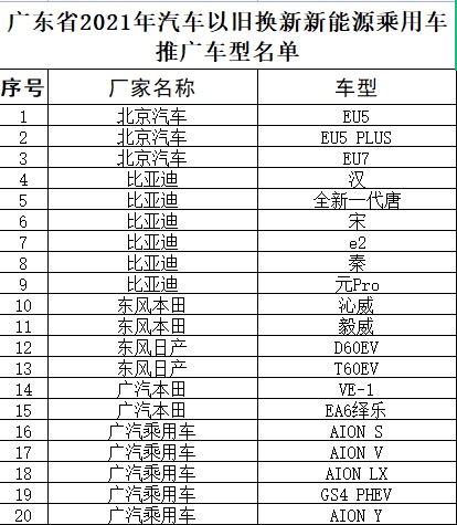 关于广东省2021年汽车以旧换新推广车型名单,广东省汽车流通协会推荐了60个燃油乘用车车型、45个新能源乘用车车型、17个货车车型作为广东省2021年汽车以旧换新推广车型。