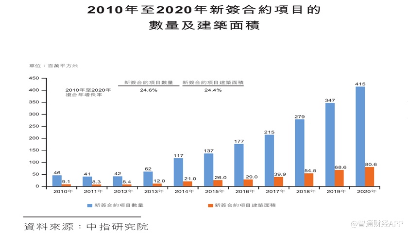 根据中国指数研究院发布的《中国房地产代建行业发展蓝皮书》,2010年至2020年,中国房地产代建市场新签合约项目数量及建筑面积的复合年增长率均超过24%。而自2015年至2019年,房地产代建行业的总收入也从27亿元快速增长至91亿元,复合年增速达34.9%。