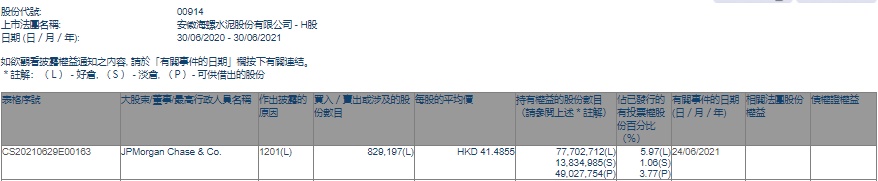智通财经APP获悉,香港联交所最新资料显示,6月24日,小摩减持海螺水泥(00914)82.9197万股,每股作价41.4855港元,总金额约为3439.97万港元。减持后最新持股数目约为7770.27万股,最新持股比例为5.97%。