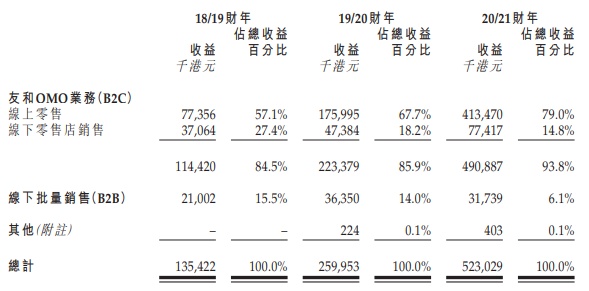 招股书显示,友和集团截至2021年3月31日止三个财政年度的整体收益及净利一直快速增长。于18/19财年、19/20财年及20/21财年,公司的总收益分别约为1.35亿港元、2.60亿港元及5.23亿港元。B2C模式下的友和OMO业务构成主要销售渠道,占整个往绩记录期间的总收益逾80.0%。尤其是,来自线上零售的收益分别占总收益约57.1%、67.7%及79.0%。