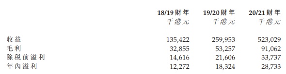 于18/19财年、19/20财年及20/21财年,毛利分别约为3285.5万港元、5325.7万港元及9106.2万港元,毛利率分别约为24.3%、20.5%及17.4%。毛利率下降的主要原因为公司为应付对产品(尤其是利润较低的若干主要品牌的电子产品及家庭电器)的需求增加而拓展产品组合,以及提供具有竞争力定价的不同产品的多项全年推广活动。年内溢利分别为1227.2万港元、1832.4万港元及2873.3万港元,净利率分别约为9.1%、7.0%及5.5%。