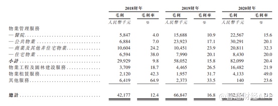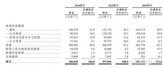 按照收入占比看,2018年至2020年,来自医院管理服务的收入占比分别为42.9%、36.2%和29.8%,来自公共物业物管服务的收入占比分别为28.9%、35.2%和30.9%,来自商业和其他非住宅物业收入占比约为12%,住宅物业的收入占比最少。总体上以医院和公共物业为主。