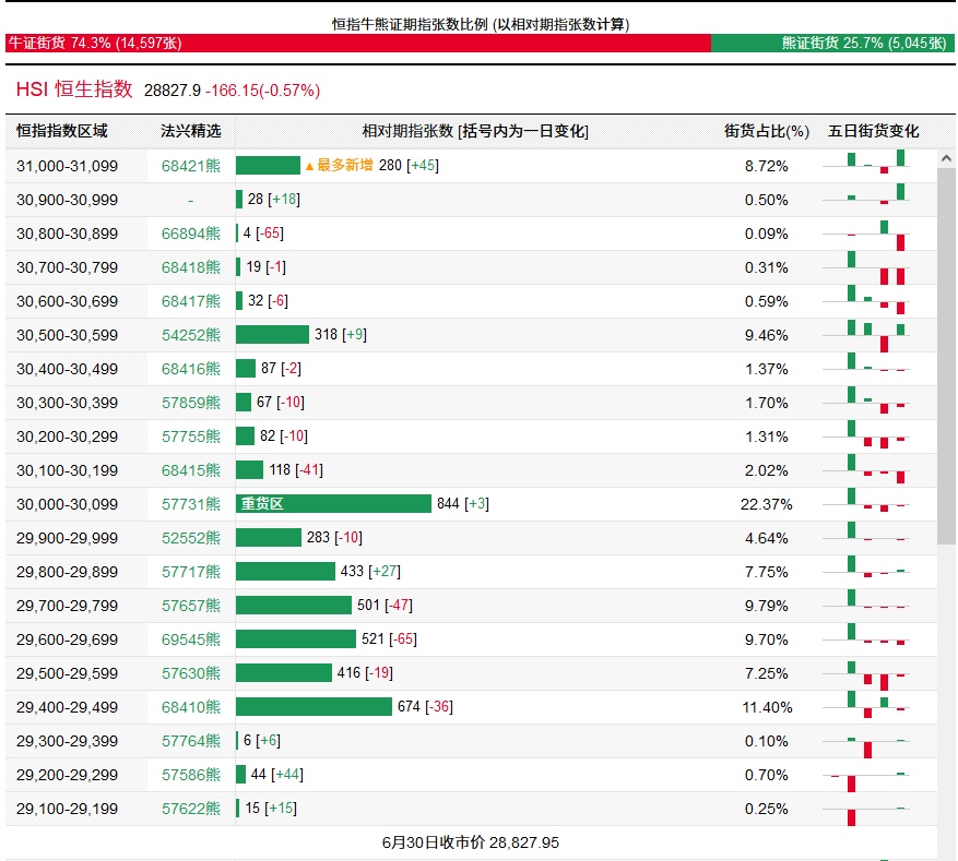 法兴恒指牛熊证街货分布图中的数据显示,熊证街货重货区在30000-30099区间,该区间最新熊证数量为844张,较上一交易日增加3张;最多新增在31000-31099区间,该区间最新熊证数量为280张,较上一交易日增加45张。