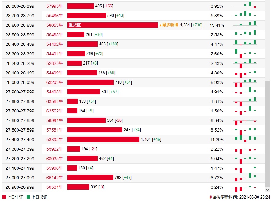 牛证街货重货区与最多新增均在28600-28699区间,该区间最新牛证数量为1384张,较上一交易日增加730涨。