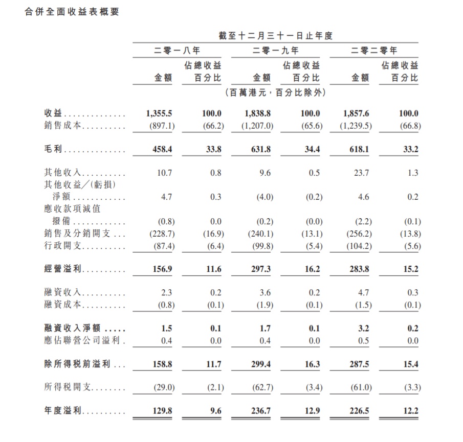 招股书显示,2018年至2020年,公司收益由13.555亿港元增加至18.576亿港元,复合年增长率为17.1%。