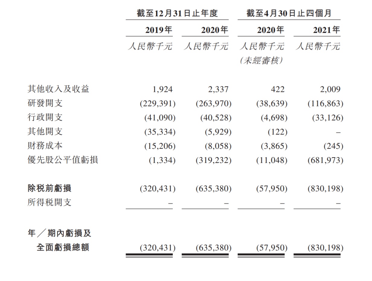 因产品尚未获准进行商业销售,因此公司尚未从产品销售中产生任何收入。于往绩记录期,公司尚未盈利,并产生经营亏损,截至2019年及2020年12月31日止年度以及截至2021年4月30日止四个月,经营亏损分别为3.204亿元(人民币,下同)、6.354亿元及8.302亿元。
