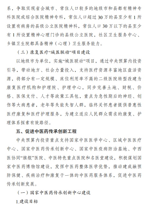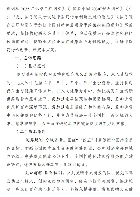为落实《中华人民共和国国民经济和社会发展第十四个五年规划和2035年远景目标纲要》《“健康中国2030”规划纲要》《中共中央、国务院关于促进中医药传承创新发展的意见》《国务院办公厅印发关于加快中医药特色发展若干政策措施的通知》等要求,加快构建强大公共卫生体系,推动优质医疗资源扩容和区域均衡布局,提高全方位全周期健康服务与保障能力,促进中医药传承创新,国家发展改革委、国家卫生健康委、国家中医药管理局和国家疾病预防控制局共同编制了《“十四五”优质高效医疗卫生服务体系建设实施方案》。现印发给你们,请认真遵照执行。