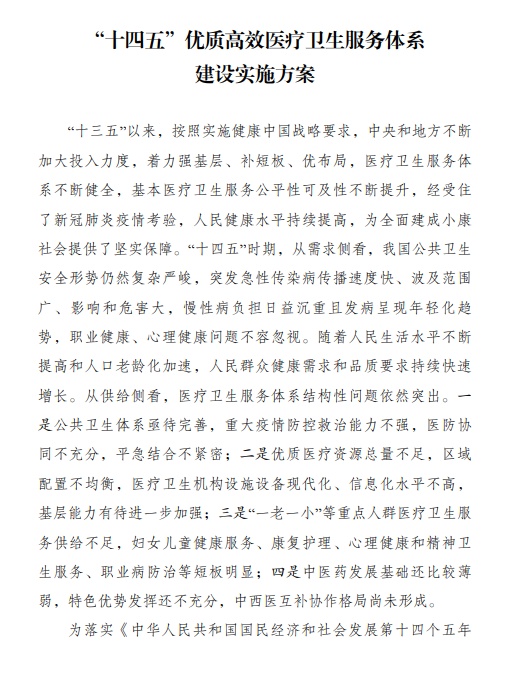 以下为关于印发《“十四五”优质高效医疗卫生服务体系建设实施方案》的通知
