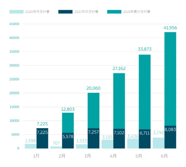 今年二季度累计交付21,896台,同比增长111.9%,环比增长9.2%,连续五个季度实现环比增长。今年上半年蔚来已完成交付41,956台,达到去年全年交付量的95.9%。