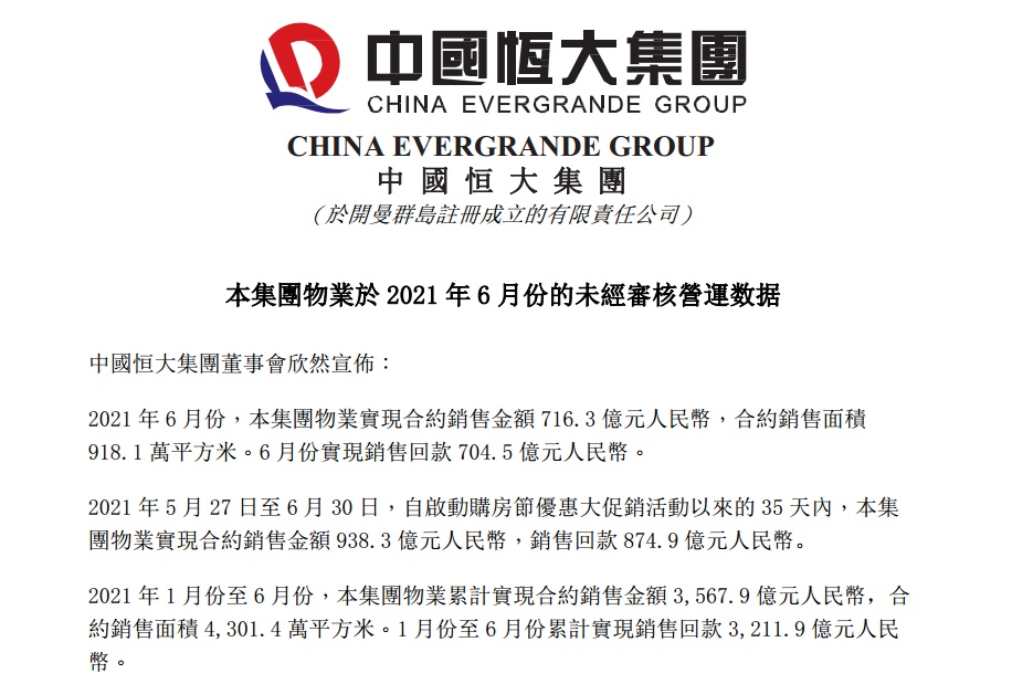7月1日,中国恒大发布公告,自启动购房节优惠大促销活动以来,从5月27日至6月30日35天内,恒大实现合约销售938.3亿元,销售回款874.9亿元,其中6月单月销售716.3亿元。今年1-6月累计实现合约销售额3567.9亿元,累计销售回款3211.9亿元。