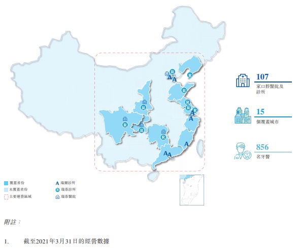 截至2021年3月31日,瑞尔集团在中国15个主要一二线城市运营107家医院和诊所,提供中高端口腔护理服务,拥有856名经验丰富的牙医。