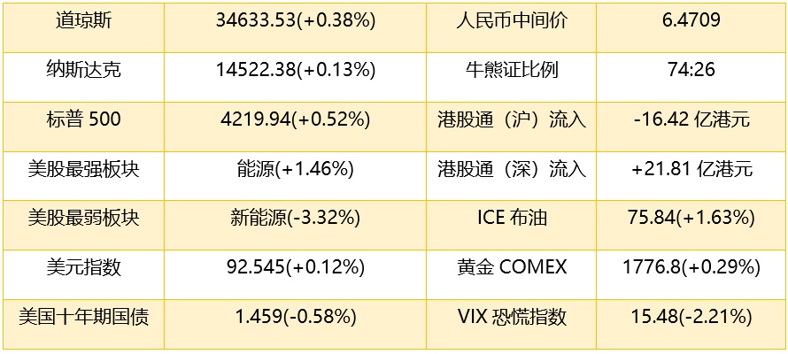 1、隔夜美股截至收盘,纳斯达克综合指数涨18.42点,涨幅0.13%,报14522.38点;道琼斯指数涨131.02点,涨幅0.38%,报34633.53点;标普500指数涨22.44点,涨幅0.52%,报4319.94点。标普500指数连续第6个交易日创历史最高收盘纪录,同时也是今年第34次创历史新高。港股ADR指数也上涨,按比例计算,收报29159点,上涨165.36点或0.57%。