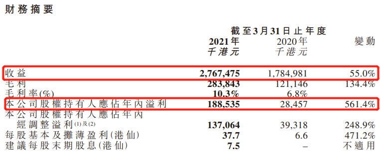 所以,可以看到,2021财年该公司的营收和净利润都呈大幅增长的状态——营收同比增长55.0%至27.67亿元港元,股东应占溢利同比暴增561.4%至1.89亿港元。