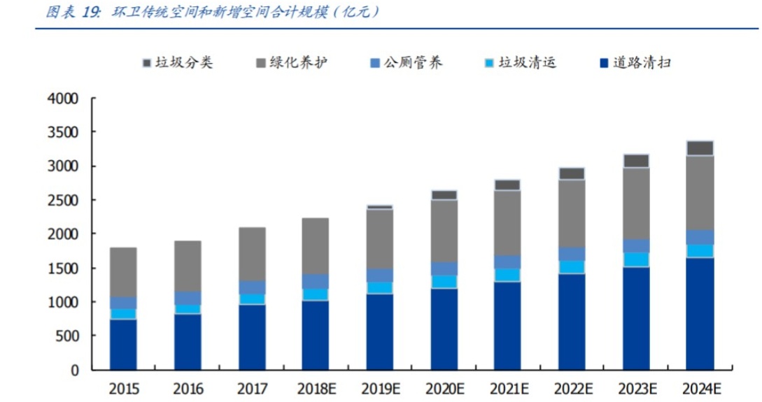 据国盛证券测算,在市场化释放、城镇化率及机械化率提升、新兴环卫空间释放合力推动下,预计2024年环卫传统空间将达到2078亿元,新增空间(绿化养护+垃圾分类)有望达到1307亿元,合计市场空间在3385亿元,整体发展空间十分广阔。