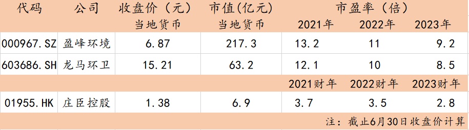 而对比同业公司盈峰环境、龙马环卫而言,结合宝新金融测算的数据计算,盈峰环境2021年至2023年,该公司的市盈率分别为13.2倍、11倍、9.2倍,龙马环卫的市盈率则分别为12.1倍、10倍、8.5倍。对照之下,不难看出目前庄臣控股相对于同业公司而言,估值处于明显低估状态。