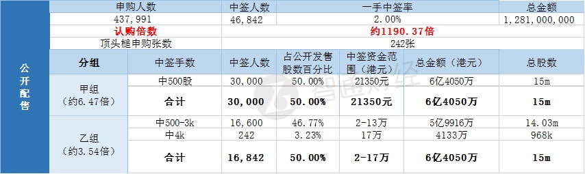 其中,公开配售申购人数437,991人,一手中签率2.00%,认购倍数约1190.37倍。