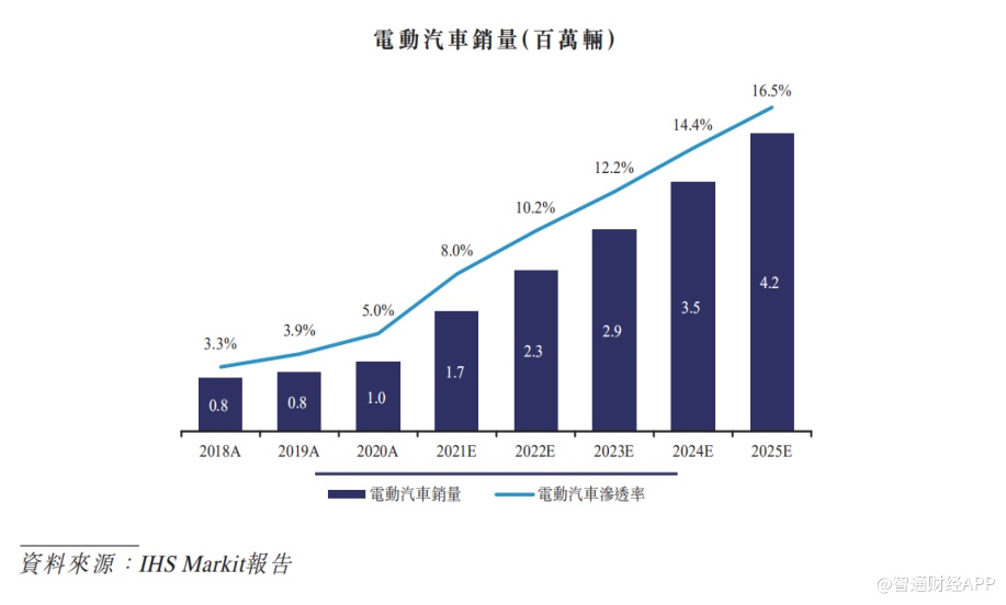 政策加持之下,中国是快速成为全球最大的电动汽车市场,2020年销量达到约100万辆。IHS Markit报告显示,中国电动汽车市场占全球电动汽车销量的45.3%,是美国电动汽车市场规模的3.7倍。预期2020年至2025年中国电动汽车销量将以33.8%的复合年增长率增长,到2025年将达到4.2百万辆。在中国电动汽车市场中,中高端市场规模最大,占2020年销量的38.3%。预期到2025年此细分市场将仍然为最大市场,销量达到190万辆。