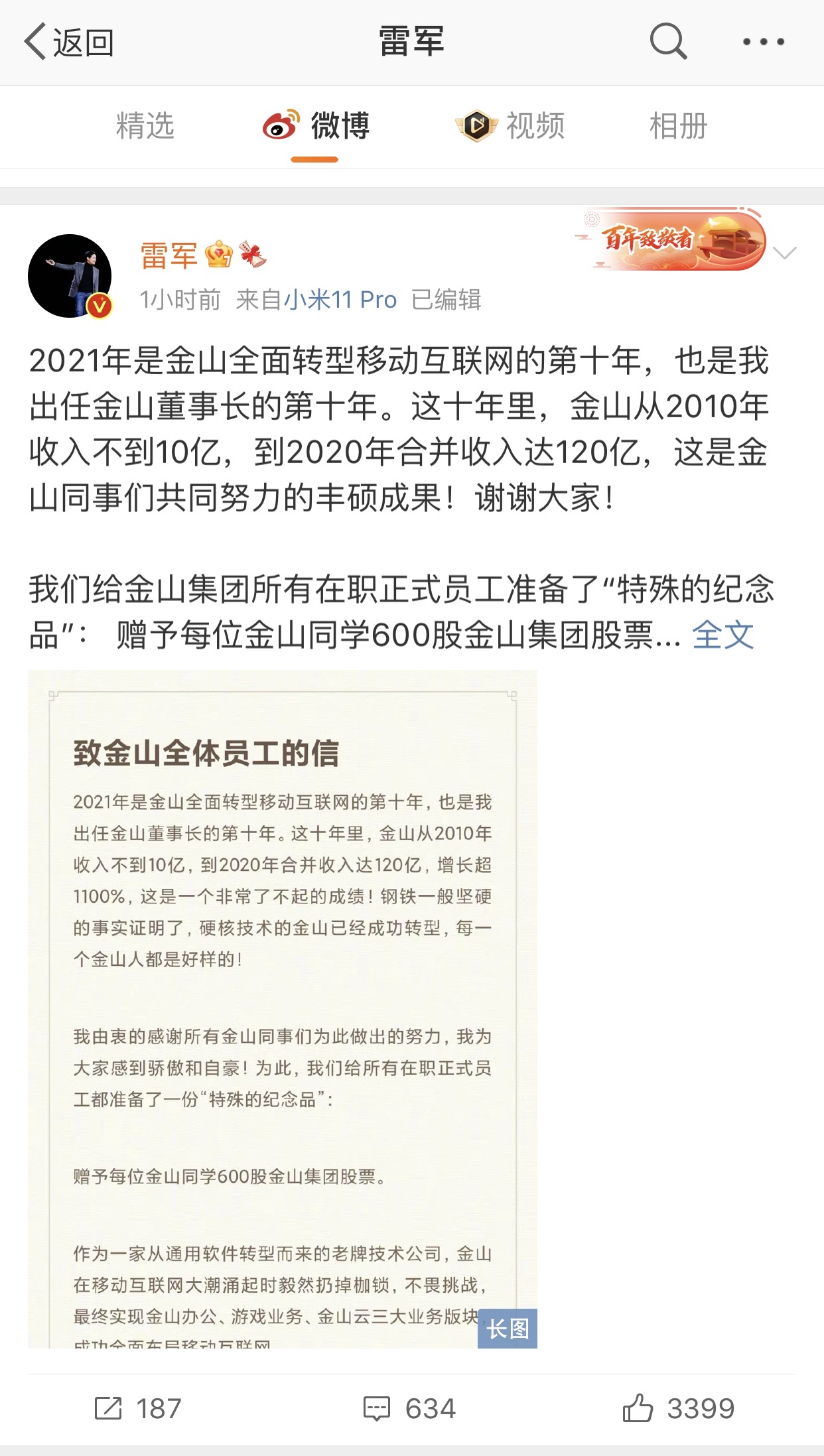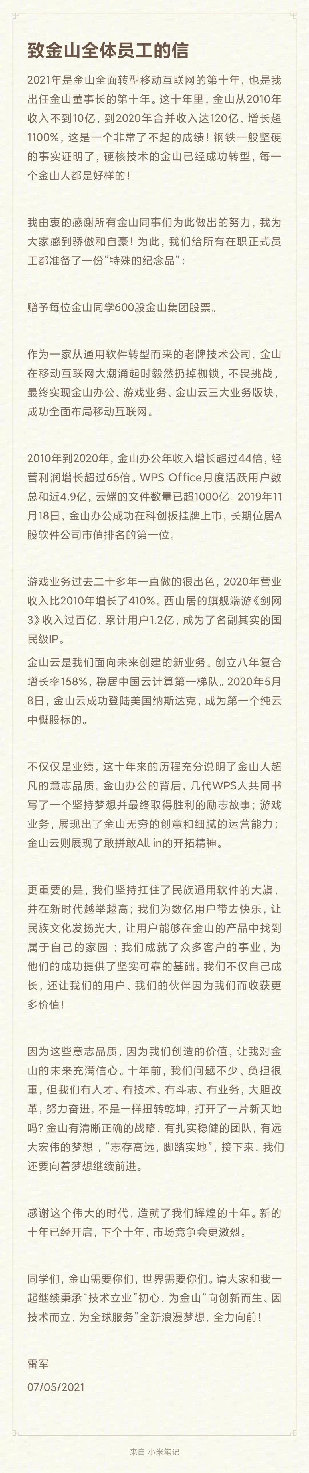 智通财经APP获悉,7月5日,小米集团(01810)董事长兼CEO、金山软件公司(03888)董事长雷军在其个人微博发布致金山全体员工的信。信中雷军称,将赠予金山集团每位在职正式员工600股股票,总计不超过480万股。