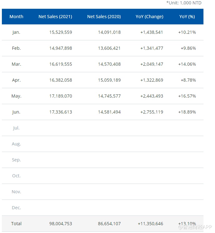 智通财经APP获悉,联电(UMC.US)公布2021年最新月度销售数据。数据显示,6月销售额为173.37亿新台币,同比增长18.89%。1-6月销售额为980.05亿新台币,同比增长13.10%。