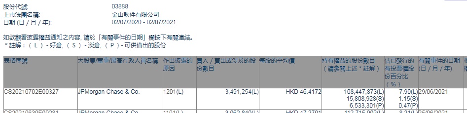 智通财经APP获悉,香港联交所最新资料显示,6月29日,摩根大通减持金山软件(03888)349.1254万股,每股作价46.4172港元,总金额约1.62亿港元,减持后最新持股数目约为1.08亿股,最新持股比例为7.90%。