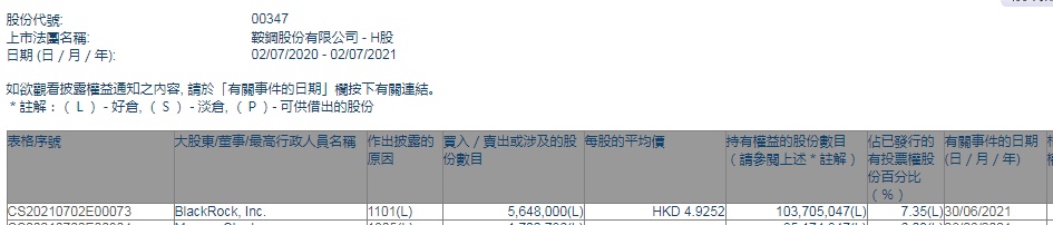 智通财经APP获悉,香港联交所最新资料显示,6月30日,贝莱德增持鞍钢股份(00347)564.8万股,每股作价4.9252港元,总金额约为2781.8万港元。增持后最新持股数目约1.04亿股,最新持股比例为7.35%。