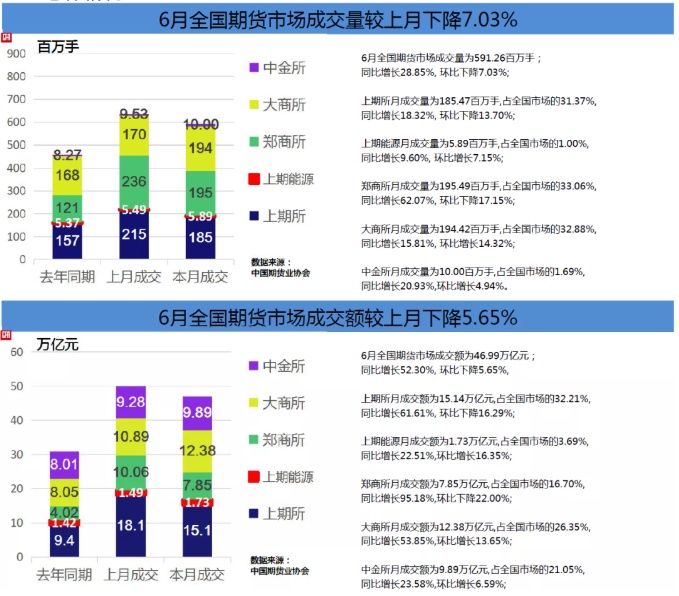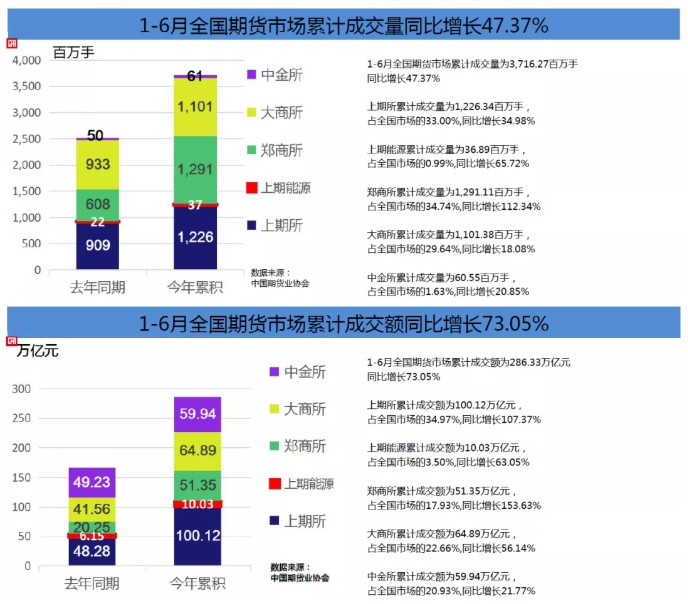智通财经APP获悉,7月5日,中国期货业协会最新统计资料表明,以单边计算,6月全国期货市场成交量为591,256,905手,成交额为469,920.35亿元,同比分别增长28.85%和52.30%,环比分别下降7.03%和5.65%。1-6月全国期货市场累计成交量为3,716,268,288手,累计成交额为2,863,329.09亿元,同比分别增长47.37%和73.05%。