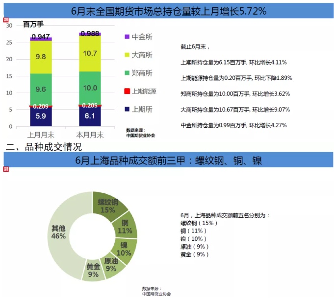 上海期货交易所6月成交量为185,467,397手,成交额为151,362.03亿元,分别占全国市场的31.37%和32.21%,同比分别增长18.32%和61.61%,环比分别下降13.70%和16.29%。6月末上海期货交易所持仓总量为6,147,167手,较上月末增长4.11%。1-6月上海期货交易所累计成交量为1,226,342,904手,累计成交额为1,001,224.32亿元,同比分别增长34.98%和107.37%,分别占全国市场的33.00%和34.97%。