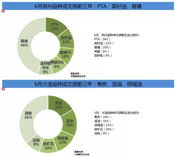大连商品交易所6月成交量为194,421,182手,成交额为123,810.12亿元,分别占全国市场的32.88%和26.35%,同比分别增长15.81%和53.85%,环比分别增长14.32%和13.65%。6月末大连商品交易所持仓总量为10,666,393手,较上月末增长9.07%。1-6月大连商品交易所累计成交量为1,101,380,251手,累计成交额为648,908.72亿元,同比分别增长18.08%和56.14%,分别占全国市场的29.64%和22.66%。