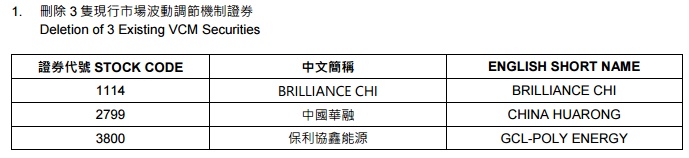 港交所:市场波动调节机制证券名单将删除华晨中国(01114)、中国华融(02799)及保利协鑫能源(03800)