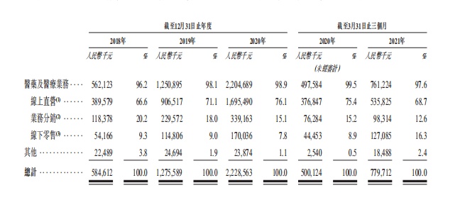 而医药及医疗业务又包括在线直营、线下零售等渠道产生的收入。其中,线上直营模式主要通过在线平台直接向用户出售产品,包括自营在线平台,如移动应用程序及微信小程序以及知名第三方在线平台;线下零售通过自建的叮当智慧药房的网络为用户提供服务。