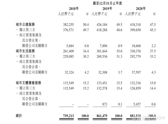 截至2020年12月31日,珠江城市管理三条业务线的收入占比分别为47.5%、37.5%和15%。其中来自第三方的收入占比分别为45.3%、33.2%和14.4%,关联方主要为珠江实业集团及合营企业联营企业等。