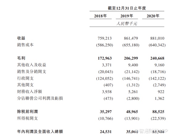 业绩方面,2018年至2020年,集团营收分别为7.59亿人民(单位下同)、8.61亿和8.81亿元,同比分别增长13.5%和2.3%。毛利分别为1.73亿、2.06亿和2.41亿元,同比分别增长19.2%和16.6%。净利润分别为2453万、3506万和6599万,同比分别增长42.9%和74%。