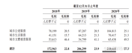 不过集团的毛利率水平有所提升,因此毛利润和净利润增速明显好于营收增长。2018年至2020年集团综合毛利率分别为22.8%、23.9%和27.3%,2020年,城市公建服务和文体运营服务的毛利率增长明显,一方面是由于疫情期间社会保险基金供款减少、租金减免等影响,而且均高于城市生活服务毛利率。