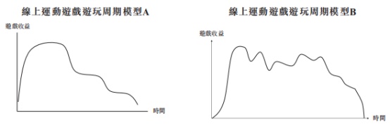 首先从线上运动游戏的游玩周期看,该类游戏的游玩周期模型主要有两种,第一种模式的游戏收益及活跃用户人数通常于游戏推出后6个月内达到高峰,且往往会在推出3年内大幅衰退并被边缘化。