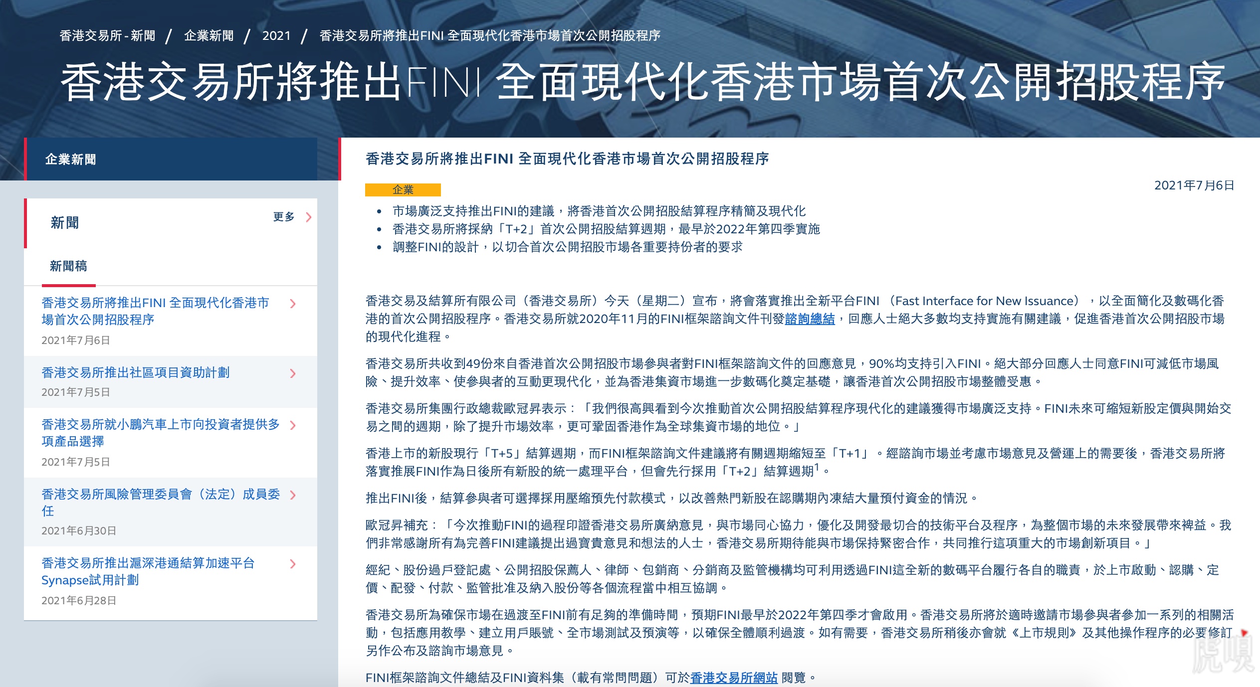 ),以全面简化及数码化香港的首次公开招股程序。香港上市的新股现行「T+5」结算周期,而FINI框架咨询文件建议将有关周期缩短至「T+1」。经咨询市场并考虑市场意见及营运上的需要后,香港交易所将落实推展FINI作为日后所有新股的统一处理平台,但会先行采用「T+2」结算周期,最早于2022年第四季实施。