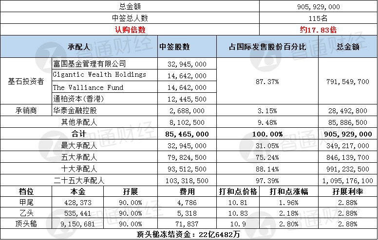 其中,公开配售申购人数153275人,一手中签率5.67%,认购倍数约113.97倍。