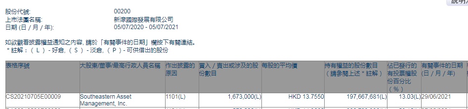 智通财经APP获悉,香港联交所最新资料显示,6月29日,Southeastern Asset Management增持新濠国际发展(00200)167.3万股,每股作价13.755港元,总金额约为2301.21万港元。增持后最新持股数目约为1.98亿股,最新持股比例为13.03%。